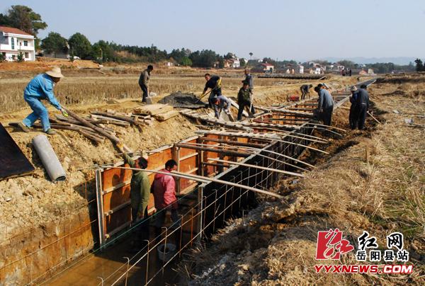 红网岳阳县站12月10日(本站记者 吴拥民 彭会 通讯员 许国湖)“突突……”,路边的汽油发电机传来阵阵轰鸣,12月9日,岳阳县农业综合开发柏祥镇鹅咀村的黄泥淑排水渠道硬化工地上,一群穿着套鞋、戴着帆布或橡胶手套的施工人员在机器的“伴奏”声中,忙活着铲土、装模、挑运水泥、上料、夯实……