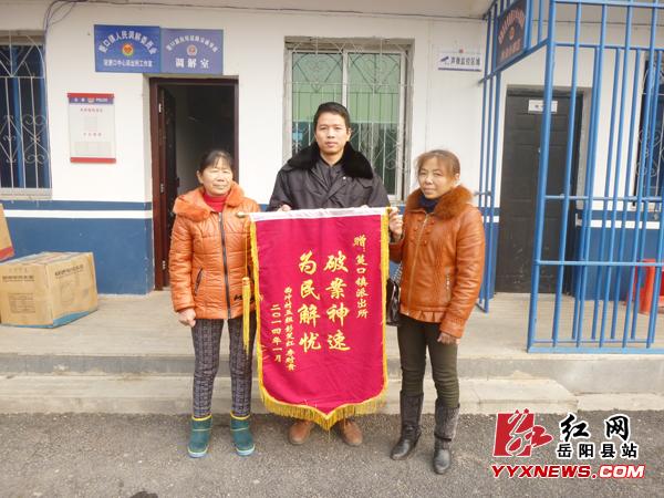 红网岳阳县站1月16日讯(通讯员 刘正)“同志,感谢你们救出了我的女儿”日前,岳阳县筻口镇界岭村村民李时桂紧握着从吉林省将女儿张某带回来的民警小刘的手连连道谢。随后,他将一面写着“破案神速”的锦旗递给筻口镇派出所民警,顿时派出所院内鞭炮噼里啪啦的响起……