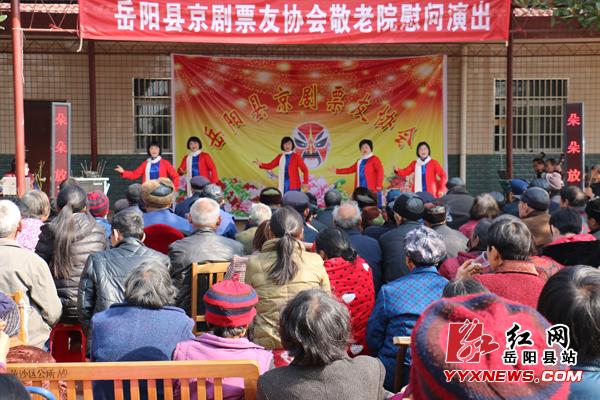 岳阳县京剧票友协会组织来到黄沙街镇敬老院开展慰问演出。演出在戏曲联唱《红梅赞》中拉开帷幕,《三娘教子》《沙家浜》《打铜锣》等12个大家喜闻乐见的戏曲节目,将演出一次次推向高潮。台下,敬老院60多名老人以及周边群众其乐融融,有得老人还一边晃脑,一边轻声和唱。敬老院里洋溢着欢声笑语,欢笑中流露出老人们对晚年生活的幸福感和满足感,同时,也体现了党和政府及社会各界的 “尊老、爱老、敬老”的良好风尚。