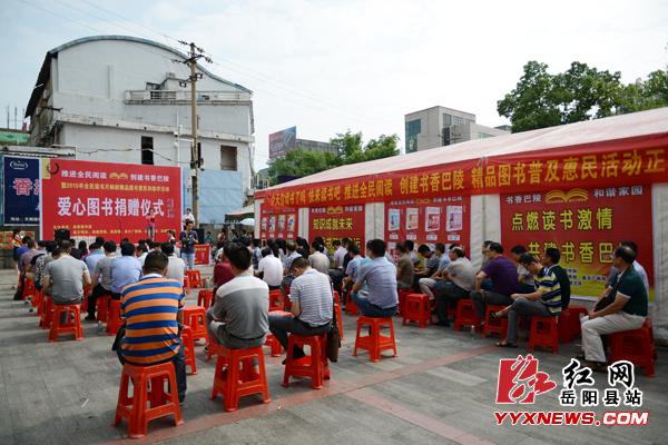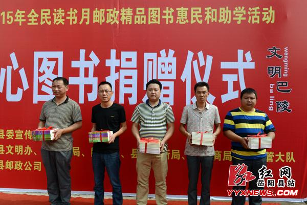 红网岳阳县站7月8日讯(分站记者 许伟军 通讯员 邱寿棉)7月8日,岳阳县“推进全民阅读,创建书香巴陵”全民阅读活动暨2015全民读书月邮政精品图书惠民助学、爱心图书捐赠仪式活动在巴陵花鼓戏传承剧院前开展。此次活动由岳阳县委宣传部主办,县文明办、县教育局、团县委、县文广新局、县工商局、县城管大队协办,县邮政公司承办,旨在进一步激发全民读书激情,提高广大人民群众思想文化素质。