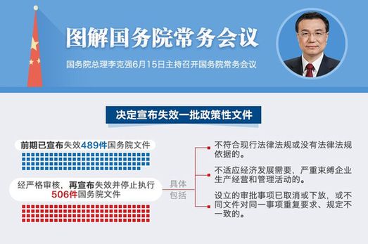 6月15日,国务院总理李克强主持召开国务院常务会议,决定在前期已宣布失效489件国务院文件的基础上,经严格审核,再宣布失效并停止执行506件国务院文件。