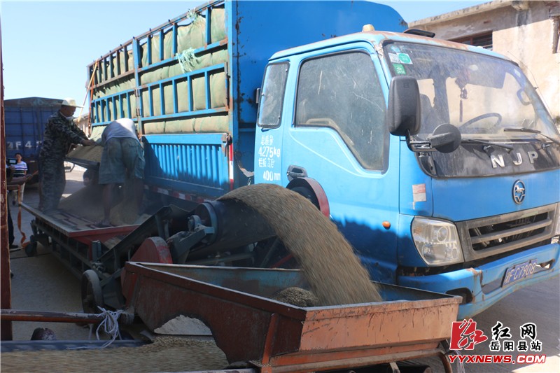 红网岳阳县分站7月19日讯(记者 毛水作)7月18日,在荣家湾粮库门外,前来卖粮的车辆排成了长队,经粮库工作人员质检和称重后,卡车上的早稻粮被自动传送带不停地运送到仓库内。看着自家的粮食有了着落,送粮农民的脸上露出了笑容。