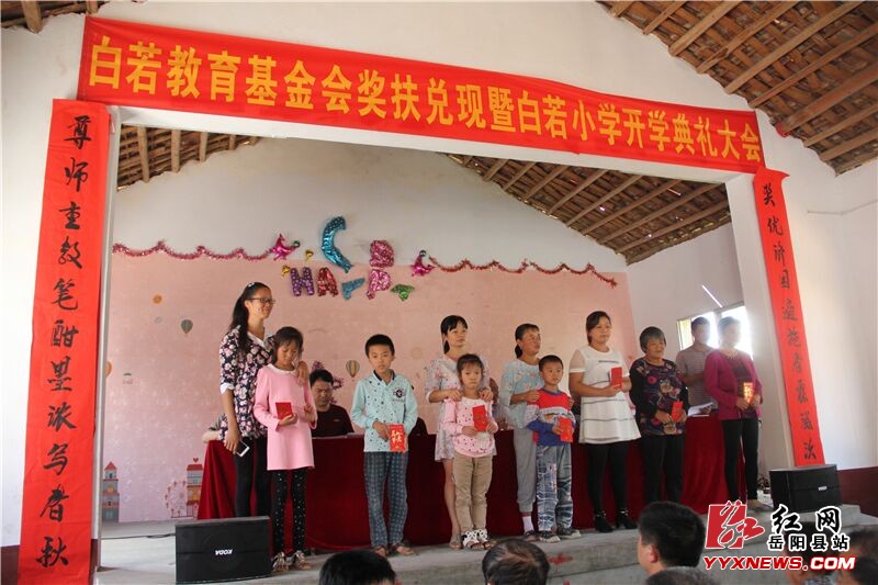 红网岳阳县分站9月13日讯(记者 付琴)9月12日,毛田镇白若教育基金会实行奖扶兑现,对13名困难学生发放生活补助13000元,对37名优秀学生、10名优秀教师奖励24100元,县关工委相关负责人参加。