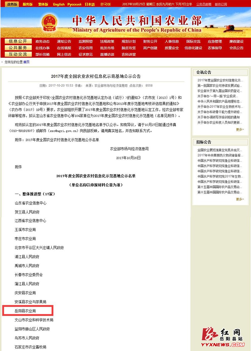 红网岳阳县分站10月25日讯(记者 李雨桑)近日,国家农业部发布《2017年度全国农业农村信息化示范基地公示公告》,我县农业局被列入2017年度全国农业农村信息化示范基地整体推进型单位公示名单。