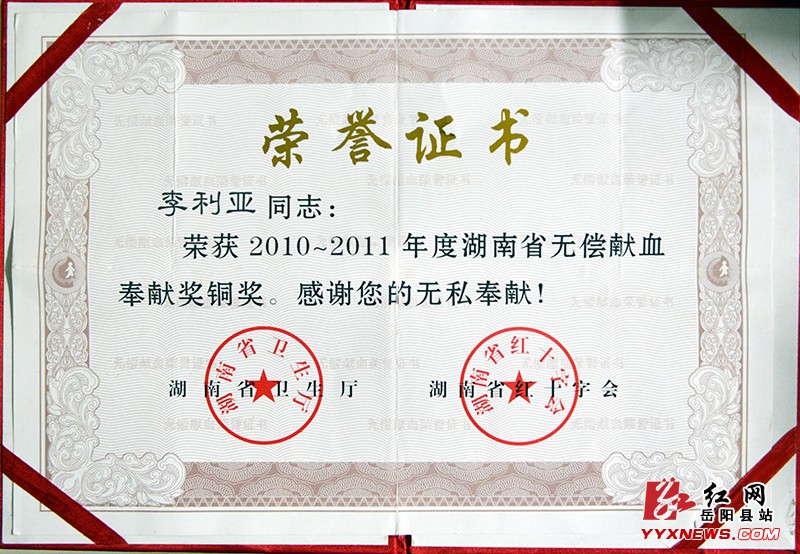 李利亚荣获湖南省红十字会颁发的奉献奖铜奖证书