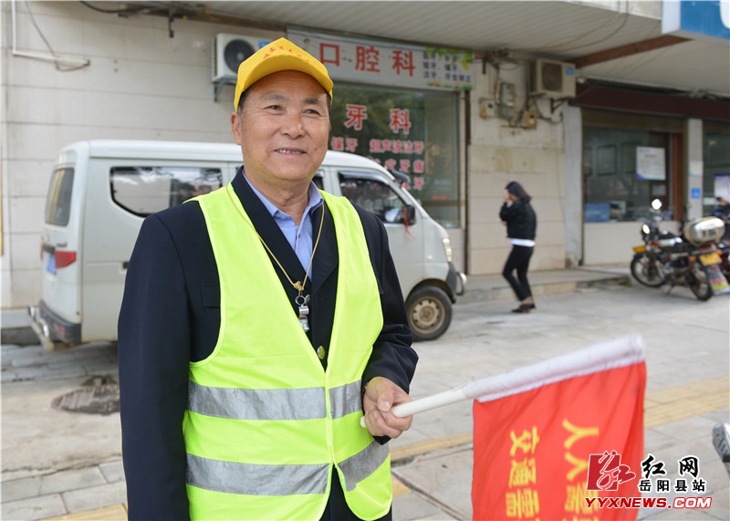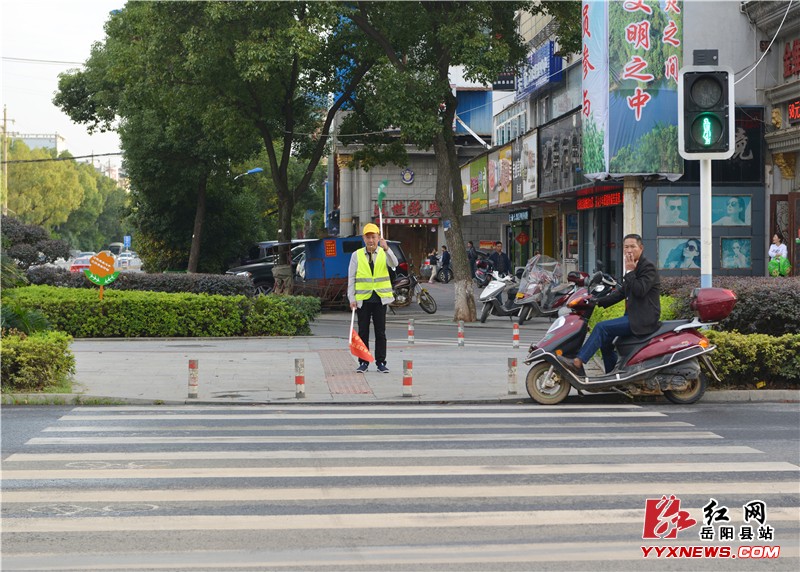 红网岳阳县分站10月17日讯(记者 付琴)“为了您和他人的安全,请退到斑马线以外,谢谢配合。”10月11日下午4时许,富荣路与天鹅路交汇处的人行道红灯亮起,身着绿色马甲、头戴小黄帽、手持文明警示旗的交通劝导员梁会山老人和往常一样,不厌其烦地规劝每一个试图闯红灯的行人。