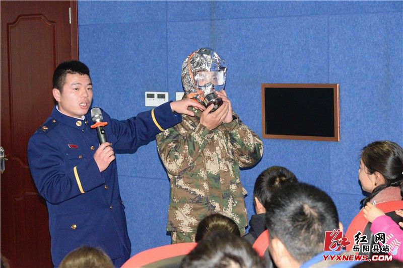 消防队员演示防烟面具的使用方法