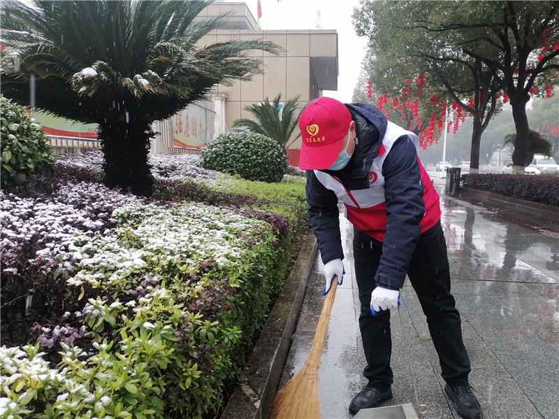 在东方西路,县七色之光党员志愿者协会的志愿者们一大早就开始清扫道路。天气虽然寒冷,但志愿者们干劲十足,认真清扫路面的积雪、冰块。眼前这位大学生志愿者叫何彪,他告诉记者,自己是大二加入志愿者队伍的,至今已有五年时间了。志愿者何彪说:“在人民群众有需求的时候,我作为一名志愿者,应当奋勇而出、义不容辞,尽最大可能给广大市民出行提供便利的条件。”