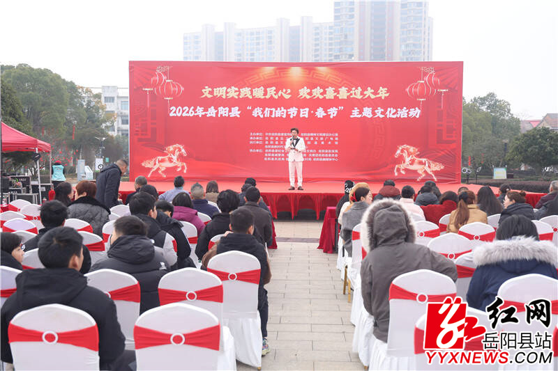 岳阳县融媒体中心2月12日讯(尹宇豪 李芳暄 周昱君)2月11日,2026年岳阳县“我们的节日·春节”主题文化活动在厚德广场(县新时代文明实践中心)举行。活动由县委宣传部、县精神文明建设办公室主办,县总工会、县文旅广电局承办,旨在通过文艺展演、互动体验和惠民服务等形式,为市民送上丰富多彩的新春文化大餐。