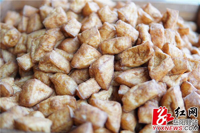 刚成型的豆腐白嫩嫩、水灵灵,手起刀落间,便被切成匀称的三角块。一谈及油豆腐的来历,张师傅便打开了话匣子:“以前做的白豆腐不耐存放,老一辈人试着把它油炸,发现不仅保质期变长了,口感也和白豆腐截然不同,更有嚼劲、更入味。就这么一代代传下来,油豆腐便在张谷英慢慢兴了起来。”