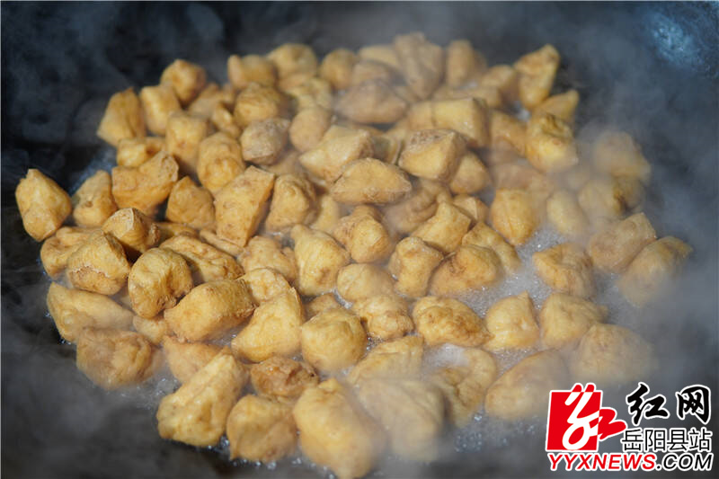 话语间,油温渐热。切好的豆腐块滑入其中,一场奇妙的蜕变悄然上演。随着油温传递,原本温润洁白的豆腐慢慢膨胀,像是注入了幸福的魔力,变得圆鼓鼓、胖嘟嘟,色泽也转为诱人的金黄,在油锅里欢快地翻滚。袅袅炊烟裹着豆香飘出屋外,与古村的红灯笼、青石板相映成趣,构成腊月里最鲜活的画面。