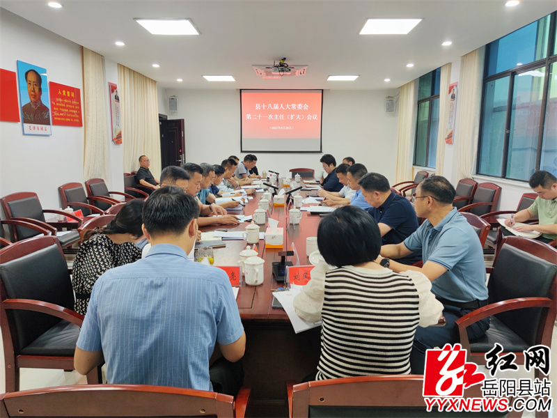 岳阳县融媒体中心8月29日讯(记者 周昱君)8月28日,县人大常委会主任、党组书记周峰主持召开县十八届人大常委会第二十一次主任(扩大)会议。县人大常委会党组副书记、副主任王卫兵,副主任彭碧芳、胡秉阳、吴承棉、任三星参加。