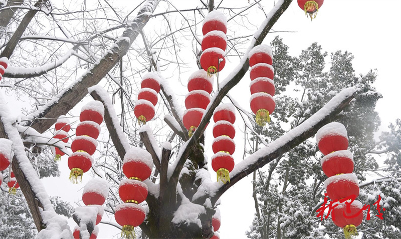 在张谷英村,白雪随风飘落,点点扬花,片片鹅毛,覆盖在具有历史韵味的瓦片上,屋顶一改往日的沧桑,好似披上了白色银装,映衬得屋内天井更加立体与鲜活,更显古村落的神秘。而为迎接新年悬挂在树上的红灯笼,与树枝随风摇曳,河里的小鸭不惧寒冷,依旧在扑腾嬉闹,让美景更添了一丝活力。