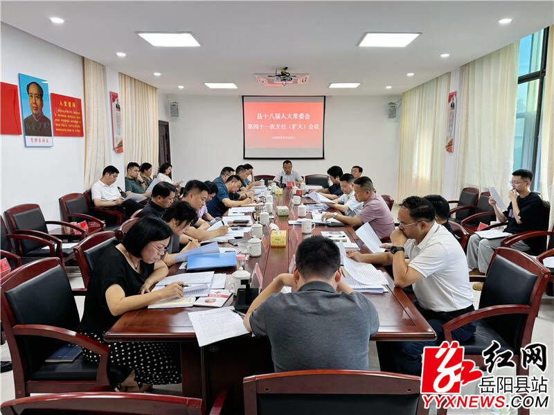 岳阳县融媒体中心6月20日讯(周昱君)6月19日,县人大常委会党组书记、主任周峰主持召开县十八届人大常委会第四十一次主任(扩大)会议,党组副书记、副主任王卫兵,副主任彭碧芳、胡秉阳、吴承棉、任三星参加会议。
